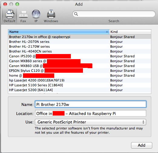 You should see your printer appear under Local Printers. So to make the Brother HL-2030 but also a Brother HL-2040 working as a network printer through a Raspberry Pi download this BRHL1620ppd file or the more complete BRHL2030-HL1250ppd and use it during the CUPS printer installation. I have no clue how to compile source code on the Raspi so can someone please do me the favor.